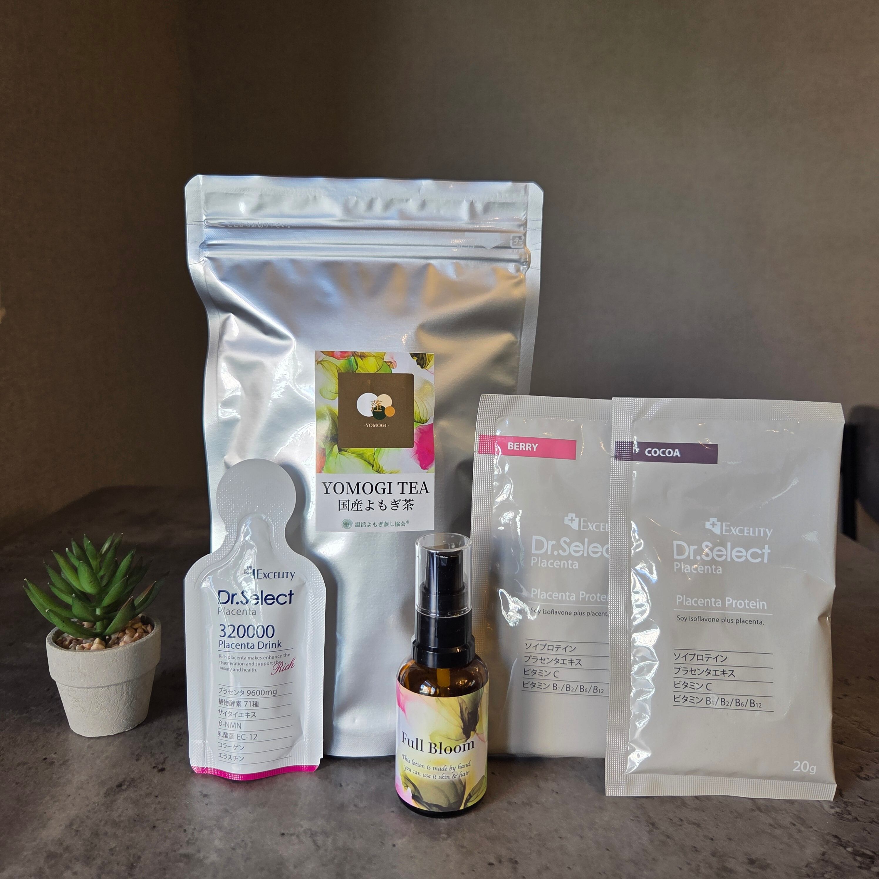 国産よもぎ茶10個パック、プロテイン2種、プラセンタが入ってFull Bloom1本分の価格で期間限定ですが販売しております!!